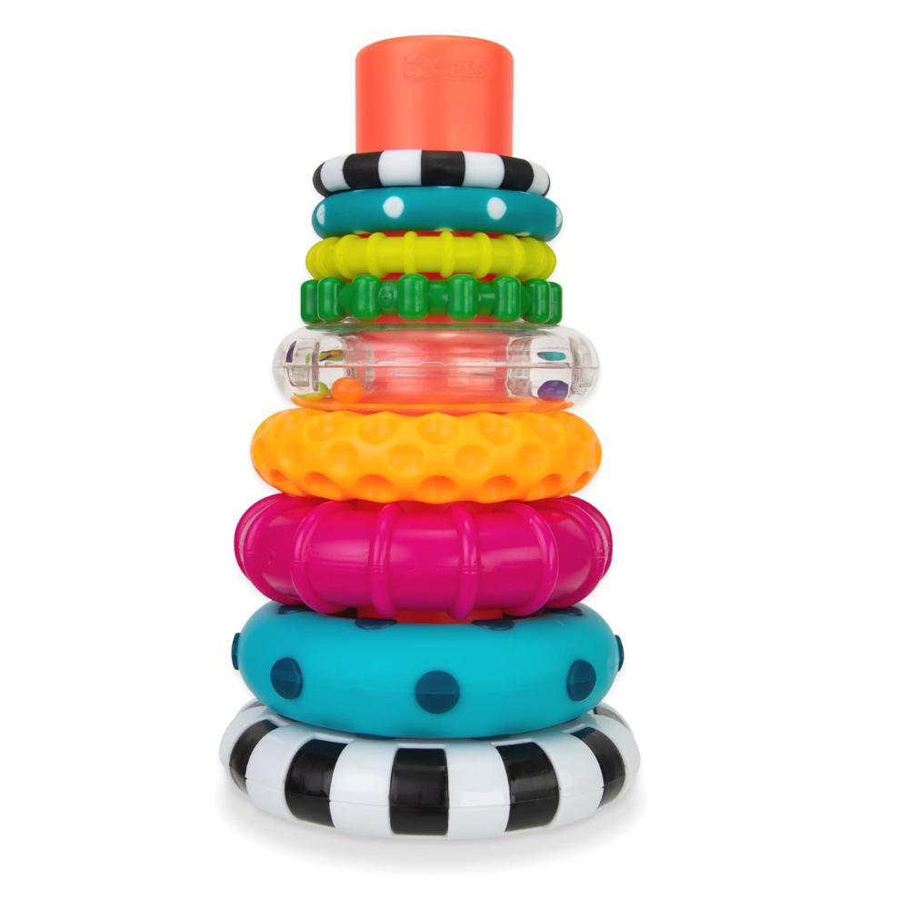 The Sassy Stacks of Circles Toy is designed with your baby's development in mind. Its varying textures and bright colors stimulate the senses, while also promoting essential skills like hand-eye coordination and counting. Each ring is made with different textures, making it perfect for babies who love to explore through mouthing.