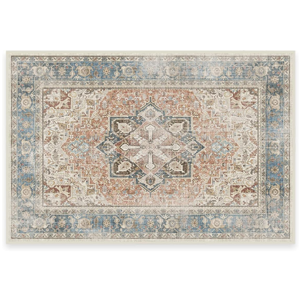 The RUGGABLE Kamran Washable Rug combines a vintage-inspired design with modern rug technology to create a unique and functional piece for any home. The classic Persian-style pattern, featuring shades of coral red and stone blue, adds a touch of elegance, while the distressed look gives it a rustic feel.
